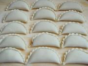 9. 然后捏上花边。10. 依次包好。11. 还包了一半另外的形状。12. 锅中水烧开,调入一点盐,下入饺子,稍做搅拌,以免粘锅。