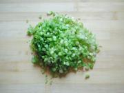 4、生姜的处理:生姜20克切成细末,如果是和好的馅马上就包,那么也可以将生姜和葱放一小勺水搅成葱姜泥,不过要是不马上包,最好包的时候再放葱花,不然肉馅的味道不好,我包的是猪肉白菜馅的,白菜馅的我习惯放些切碎的海米或虾皮,这个一定要根据自己的口味决定放还是不放,可以在这一步放5克白糖提鲜,放入生姜再拌匀。