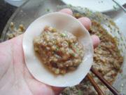 操作方法:在五花肉馅中依次加入姜末、鸡蛋、生抽、老抽,进行搅拌。然后依次加入精盐、味精、鸡精、十三香、胡椒粉再次搅拌。此时加入一小碗左右的葱姜水(用葱、姜泡制而成),边加水边搅拌,使馅料松软。最后加入葱油、香油、大葱,搅拌均匀即可。