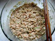 2.将调味料和肉末一起剁,这样是使肉末更易入味。而且葱姜要剁到只闻气味不见其身,也就是要剁得细小细小的。放调味料时要注意顺序,一定要先放酱油,后放盐,这样酱油的鲜味会融入肉里,如果先放盐,盐会阻碍酱油鲜味融入肉里。