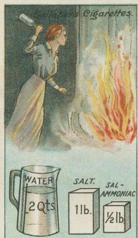 将一磅盐、半磅卤砂溶解在两夸脱的水里。将这个混合物装在细小的玻璃瓶中,一旦发生火灾,将一个或者多个装有这种液体的瓶子扔进火焰,任何严重的火灾都有可能避免。