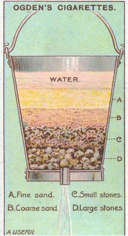 最简单有效的滤水器可以用一个干净的锌制水桶来做成。在水桶的底部钻一个小孔,并装上一小段管道。水通过细沙和粗砂层渗透到经过挑选的干净砾石和石头后,到达桶的底部。经过几层的过滤,从桶底流出来的水是一个干净的状态。