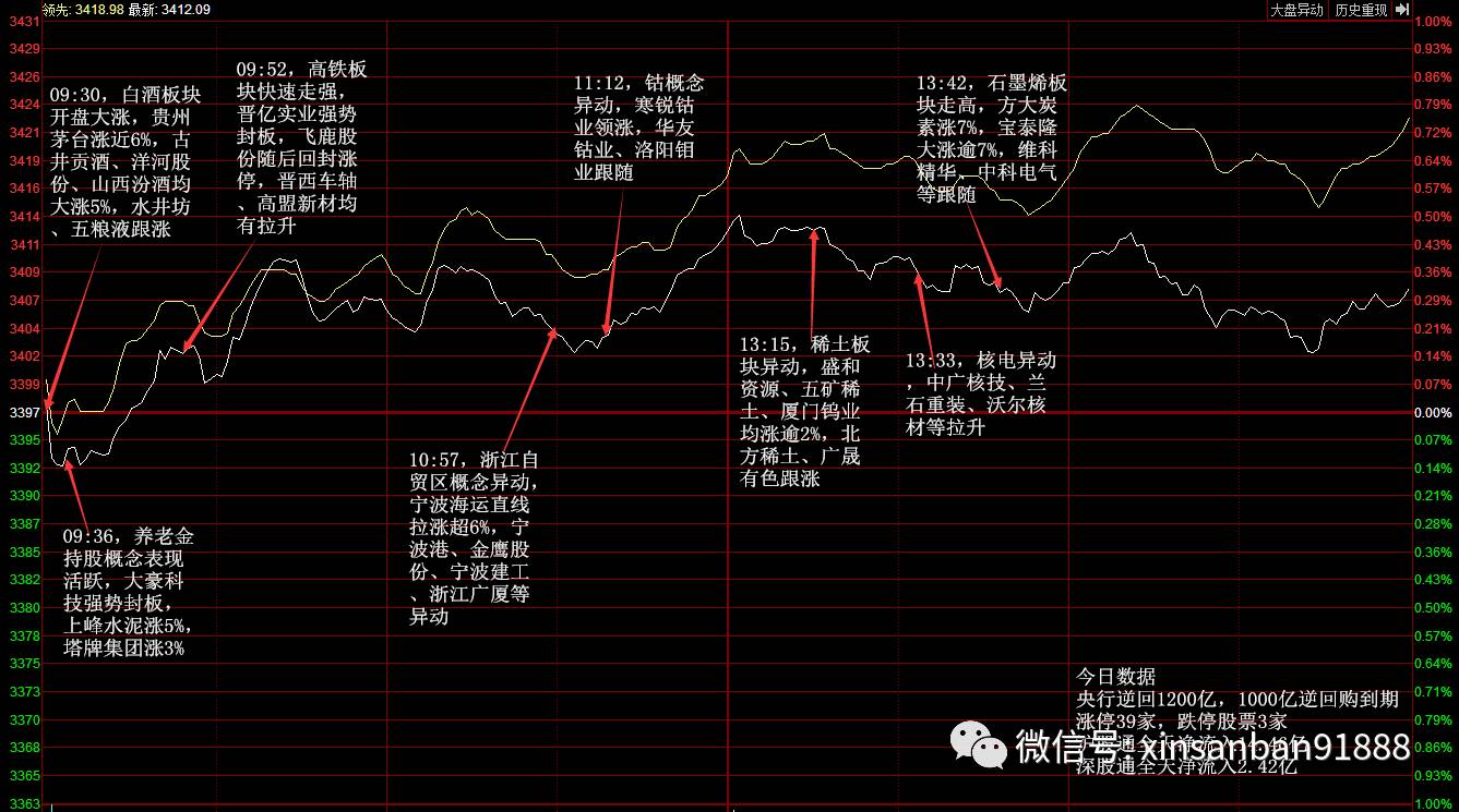 沪指站上3400点,高铁板块走强。盘面上,铁路基建、酿酒、半导体等板块涨幅居前;银行、医药、环境保护等板块跌幅居前。盘面资源股集体反弹,高铁概念也出现涨停潮,题材股轮番活跃,指数放量突破,引导市场继续看多,赚钱效应好转。 今日大盘解析: