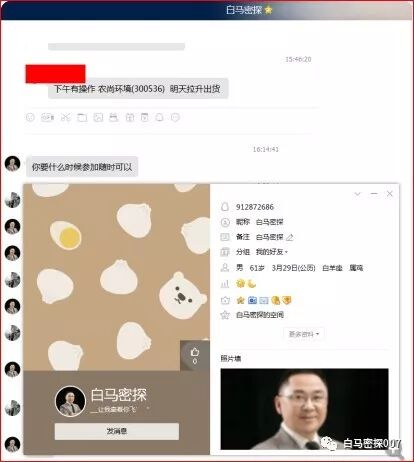 白马密探今天非常惊恐!不知道从何方冒出的神圣,本领高强,牛得不能再牛了!却又在克隆白马密探进行“荐股收费”之类的骗人活动。特别是盗用我的照片、侵犯我的肖像权。请看假冒内容: 一、假冒QQ: 说明:照片用的是我的,而QQ号码不是我的。白马密探唯一QQ号码:1156898652,和此号不同的皆为假冒。