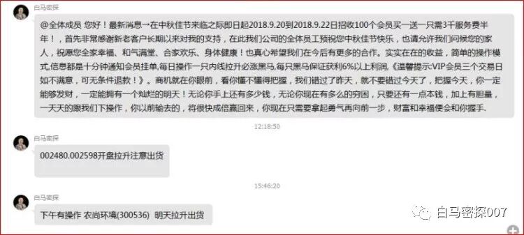 二、假冒荐股: 原文: @全体成员 您好!最新消息→在中秋佳节来临之际即日起2018.9.20到2018.9.22日招收100个会员买一送一只需3千服务费半年!,首先非常感谢新老客户长期以来对我的支持,在此我们公司的全体员工预祝您中秋佳节快乐,也请允许我们问候您的家人,祝愿您全家幸福、和气满堂、合家欢乐、身体健康!也真心希望我们在今后有更多的合作。实实在在的收益,简单的操作模式,信息都是十分钟通知会员挂单,每日操作一只内线拉升必涨黑马,每只黑马保证获利6%以上利润,《温馨提示:VIP会员三个交易日如不满意,可无条件退款!》。商机就在你眼前,看你懂不懂得把握,我们错过了昨天,就不要错过今天了,把握今天,你一定能够发财,一定能拥有一个灿烂的明天!无论你手上还有多少钱,无论你现在有多么的穷困,只要还有一点本钱,加上有胆量,一天天的跟我们下操作,你以前输去的,将很快成倍赢回来,你现在只需要拿起勇气再向前一步,财富和幸福便会和你握手. 12:18:50