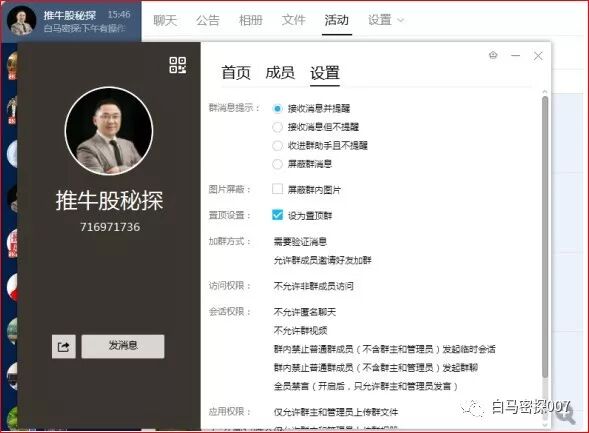 三、假冒QQ群: 说明:盗用白马密探的照片,建立荐股群。大家只要静心思考一下,那么牛气的人还需要荐股收费吗?有这样从天上掉下来的馅饼吗?
