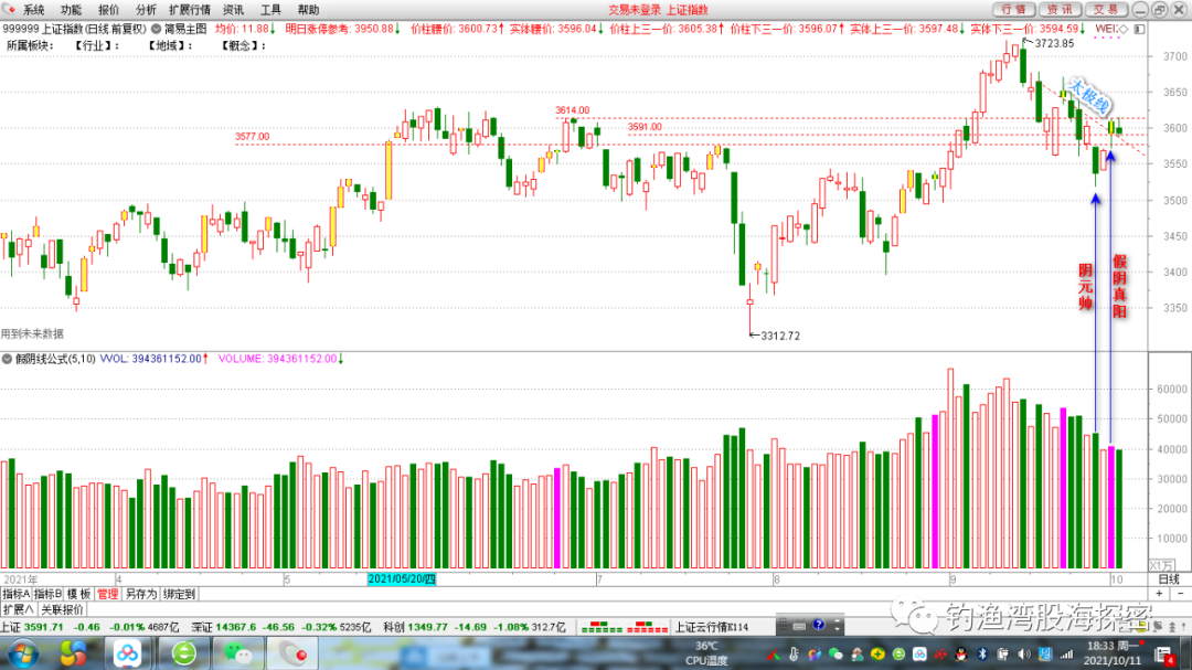 二、今日回放   1011大盘以预设上线3600开盘后震荡回落,以比昨日预判上线低1个点的3591点收盘。
