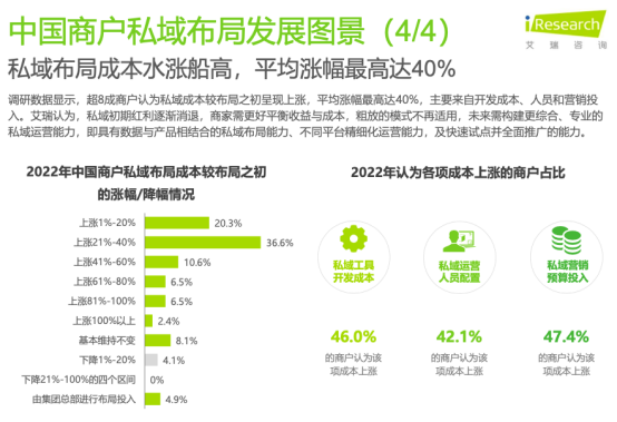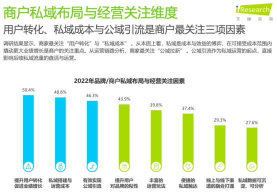 与私域行业爆发相对应的是成本水涨船高,超8成被调研商家认为,私域成本较布局之初出现上涨,平均涨幅最高40%。主要原因是初期红利逐渐消退,粗放的经营模式已不再适用,商家需协调人力、资源等进行更精细的运营。因此,对商家来说,转化效率、公域引流成为私域经营最关注的因素。