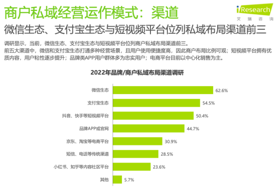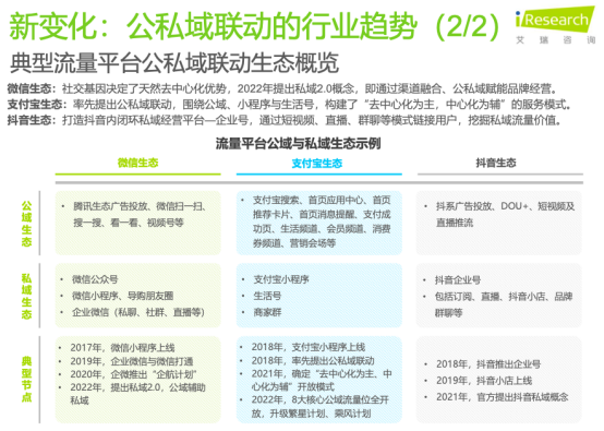 艾瑞咨询分析师冉桓宇认为,公域流量价值不容忽视,为商户提供“活水”,是私域流量的重要来源,决定了私域留存与运营的效率;另外,公私域联动具备长期价值,有助于商户基于全域视角识别痛点、制定策略。 各大平台中,支付宝2018年率先提出公私域结合,目前已开放了8大核心公域与小程序、生活号等私域打通;微信2022年提出私域2.0概念也谈及公私域赋能商家;另外,抖音也提出私域概念,快手也表示将公私域结合助力商家经营。