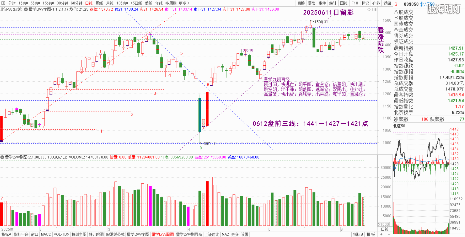 北证50指数0612日盘前一线:1441-1427-1421点,三线看涨防跌。