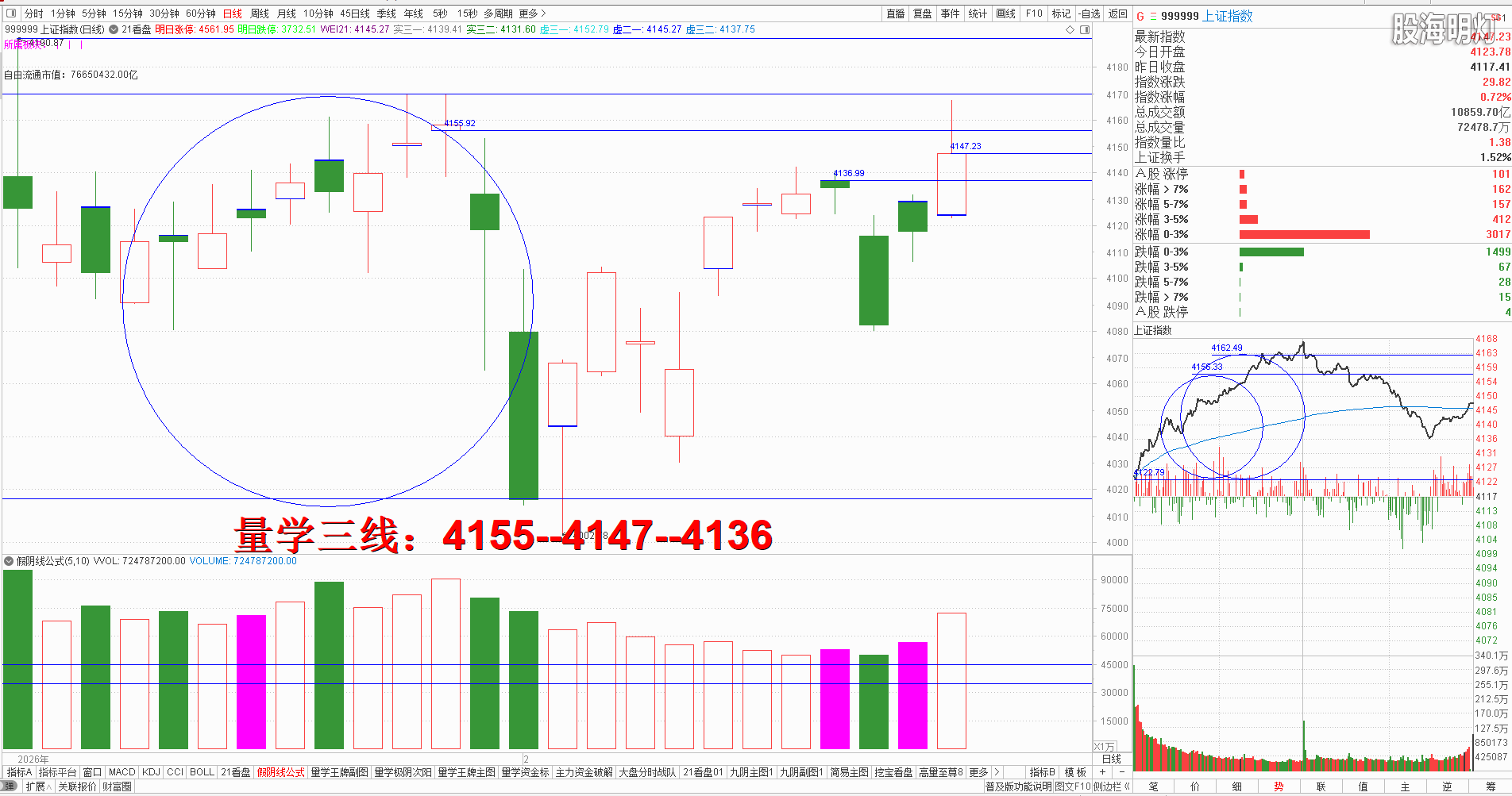 一、 昨日研判量学“假阴真阳,牵牛待涨”知识点是假阴当天先进行逢高替领模拟训练,再静候次日真阳盖假阴实顶后择机模拟精练,而不是在假阴当天就盲目冲进去,而假阴真阳当天当阴看,所以今天盘中是放量阴,首先需回避次日可能出现的继续回落,一旦该跌不跌阳盖假阴,才是稳健者可以开始模拟训练的标准,有了量学明确的标准,我们进退就有科学的参照,只要我们把自己变成机器人,我们就可以排除外界的任何影响,不带任何个人情绪的执行量学标准,量学【上日三线】:4129--4117--4115(4102)。早盘竞价高开强势信号,结合量学三线知识点,有效站稳预定上线可模拟训练量学替领精练知识点,稳健者可继续结合正在持有案例模拟训练量学替领精练知识点,开盘后量波天线站稳人线开始震荡拉升,中午收盘前以中阳形态兵临4169点左峰下方,这是就需结合量学峰顶线知识点,从下向上攻击,触及左峰不过可择机模拟训练高抛替领,突破站上左峰方可持有待涨或择机伏击,下午开盘后稍作上攻差2个点不能突破4169点左峰,其后形成量波峰顶下降,这时就是最佳的模拟训练高抛替领的机会,其后受风向标券券连续跳水挖坑的影响,大盘跟随一路跳水下行,尾盘虽有反弹,最终收盘小中阳单枪,对应量柱明显放量,结合三先规律量柱语言解读,说明4169点左峰依然还有较大压力需要消化,长上影说明今日上方压力较大,后势还有调整震荡的需求,今日单枪首次突破最近左峰4136点,明日还需关注4136点左峰支撑有效,只要此线继续站稳不破且对应明显缩量,我们可结合量学不见九阴不下车,继续模拟训练量学替领精练知识点,短线高手可模拟训练“不理震荡,精练案例”。一旦明日缩量确认今日高量柱,后势只要高量不破,均可继续模拟训练替领精练知识点,跌破高量实底才是模拟训练九阴真经——高量破的标准。明日量学【上日三线】:4155--4147--4136.