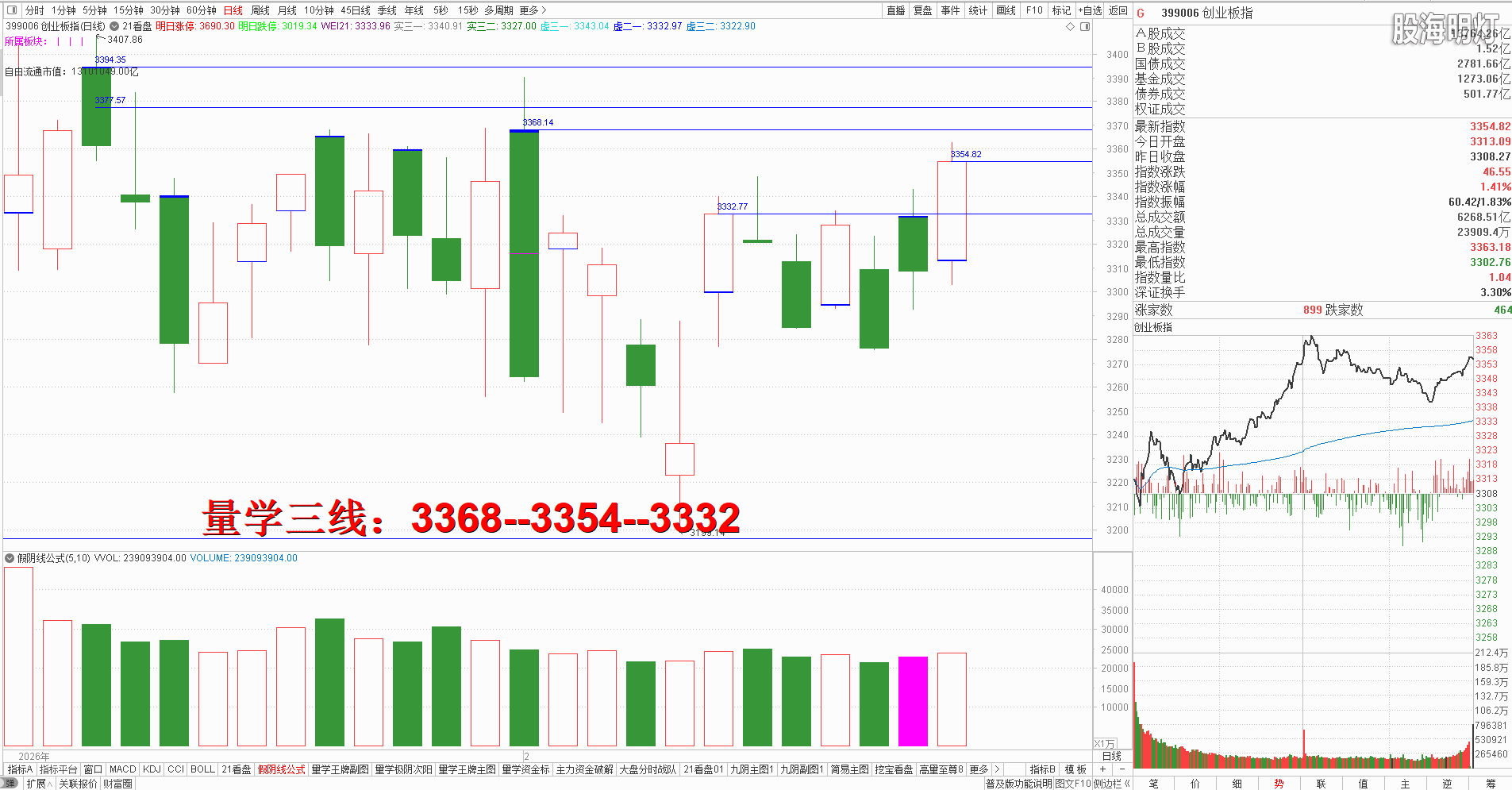 二、创业板研判:今天竞价高开后开盘稍作震荡开始震荡拉升,收盘中阳对应量柱微增量,结合三线明日看跌防涨,一旦调整,只要不破3332点最近左峰。量学三段以上高手可继续模拟训练“不理指数,精练个谷”;涨停趋势依然是量学“极阴次阳回马枪战法+凹里淘金战法”为主,今日收盘7只20CM,模拟训练难度非常考验量学功底;后势涨停趋势可继续模拟学习量学凹底淘金知识点+极阴次阳回马枪+康桥战法模拟训练,要特别训练出现首跌缩量,精准回踩重要量线出现有效次阳后出现量学刹车王牌柱知识点后,看不懂量学建构,不明白量学量波技术原理,切忌盘中盲目追涨杀跌,看不懂就不要强求。模拟训练一定要训练在自己认知之内的案例,看不懂的案例还需做到:宁错过,不做错。一般人最好耐心模拟学习量学不见次阳不动心知识点。 明日量学【创业板三线】:3368--3354--3332.