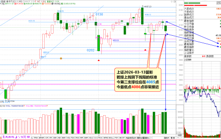 盘前预报,传经送宝;十年靓号,好评如潮。 一、预报聚焦上证2026-03-13留影 昨日(0312)预判今日(0313)看跌正确,预警今日(0313)应该五出也正确,但预设三线失误,原因如下: 若按上行找阴、下行找阳的标准, 今日第二支撑位应在4085点; 今日实际最 [详细内容]